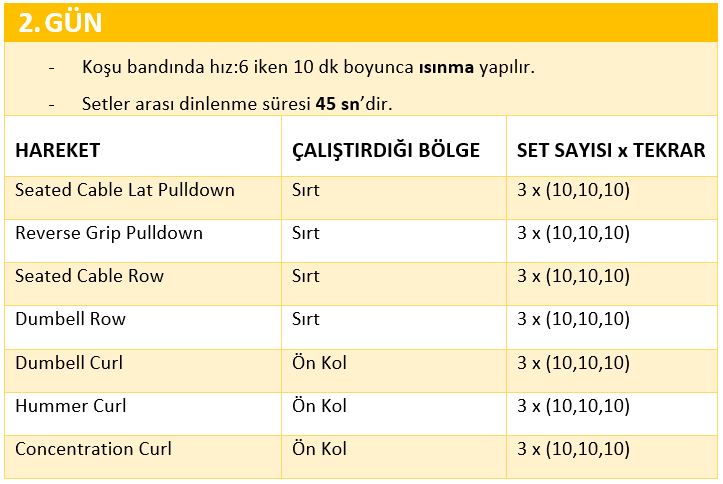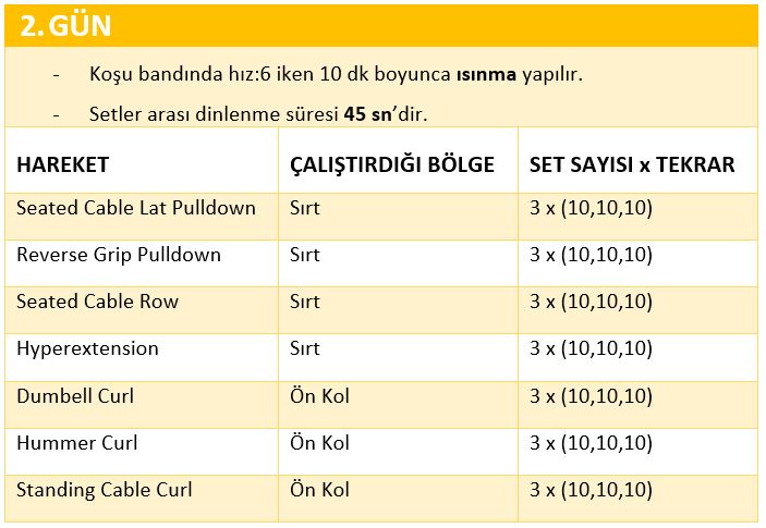 Sonraki 8 hafta boyunca haftada 4 gün antrenman yapılması gerekmektedir. Ve her gün vücudun ayrı bölgeleri çalıştırılmaktadır. Aşağıdaki örnek programı uygulayabilirsiniz.