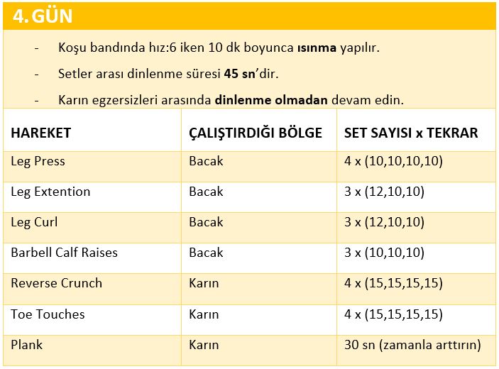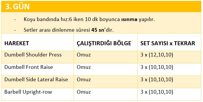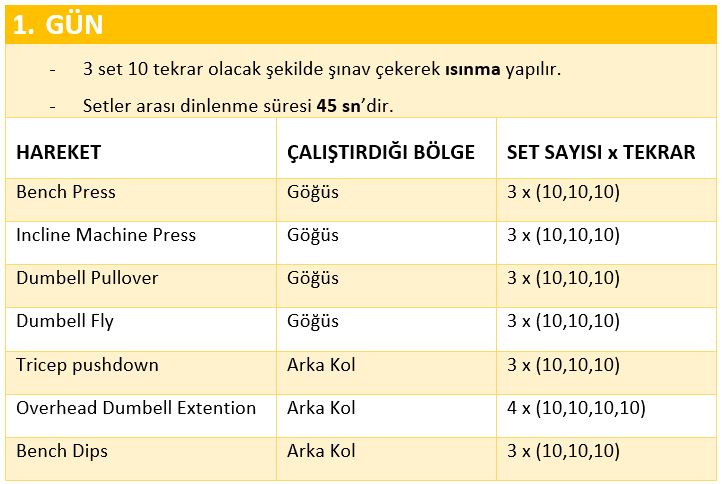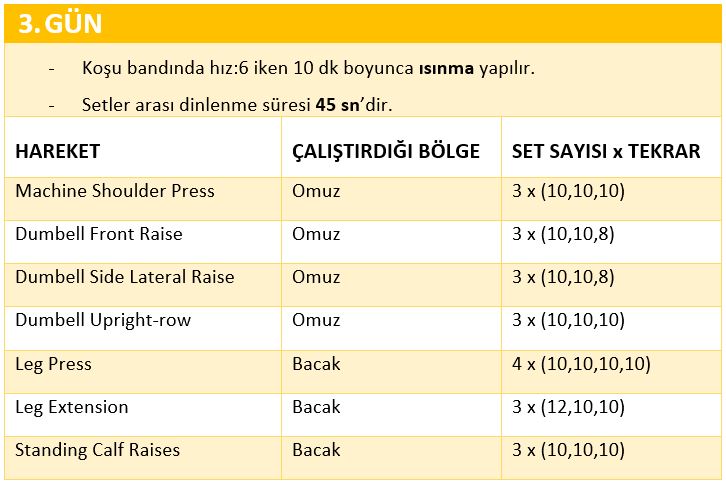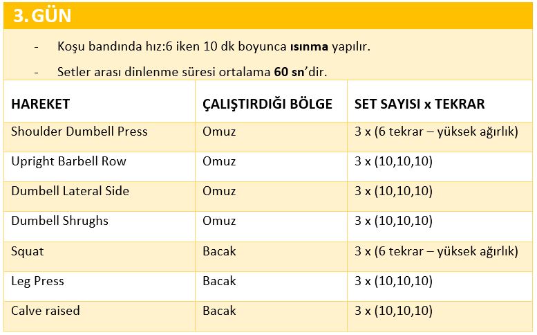 Başlangıç seviyesinde ilk 4 hafta boyunca haftada 3 gün antrenman yapılması gerekmektedir. Ve her gün vücudun ayrı bölgeleri çalıştırılmaktadır. Aşağıdaki örnek programı uygulayabilirsiniz.
