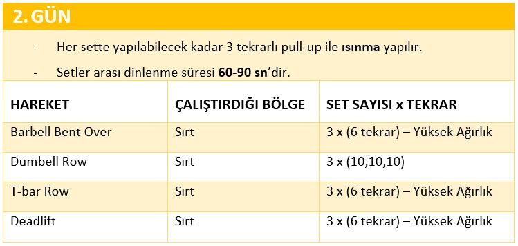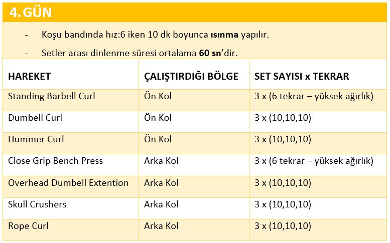 Sonraki 12 hafta boyunca haftada 4 gün antrenman yapılması gerekmektedir. Ve her gün vücudun ayrı bölgeleri çalıştırılmaktadır. Aşağıdaki örnek programı uygulayabilirsiniz.